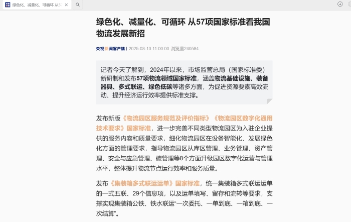 2025年3月13日,央視新聞報道:2024年以來,市場監管總局(國家標準委)新研制和發布57項物流領域國家標準,涵蓋物流基礎設施、裝備器具、多式聯運、綠色低碳等諸多方面,為促進資源要素高效流動、提升經濟運行效率提供標準支撐。