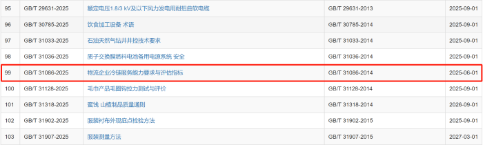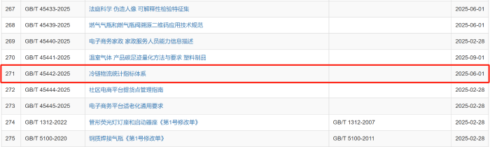 2025年2月28日,國家市場監督管理總局、國家標準化管理委員會批準發布282項國家標準,其中包括由全國物流標準化技術委員會提出并歸口的《冷鏈物流統計指標體系》(GB/T 45442-2025)和《物流企業冷鏈服務能力要求與評估指標》(GB/T 31086-2025)兩項國家標準。