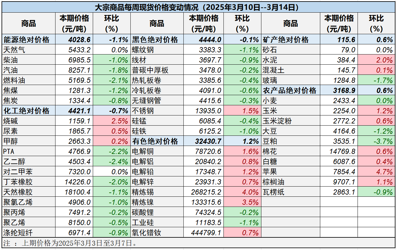 本表所示大宗商品價(jià)格(類別與產(chǎn)品規(guī)格說明見附表)為以人民幣計(jì)價(jià)的現(xiàn)貨價(jià)格(包含流通費(fèi)用、利潤和稅費(fèi)等)。計(jì)算這些價(jià)格時(shí)使用的信息來源,主要包括國內(nèi)重點(diǎn)地區(qū)的生產(chǎn)商、貿(mào)易商及下游消費(fèi)企業(yè)之間的成交、詢報(bào)盤及可成交價(jià)格。價(jià)格單位為人民幣元/噸。