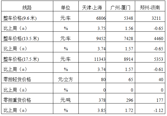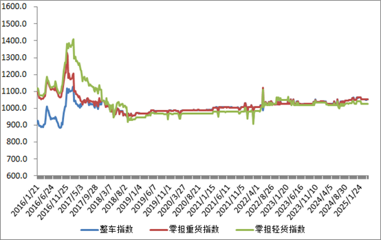 分車型看,各車型指數環比小幅回調。其中,整車指數為1053.03點,比上周回升0.10%;零擔輕貨指數為1027.39點,比上周回升0.01%;零擔重貨指數為1052.54點,比上周回升0.09%。