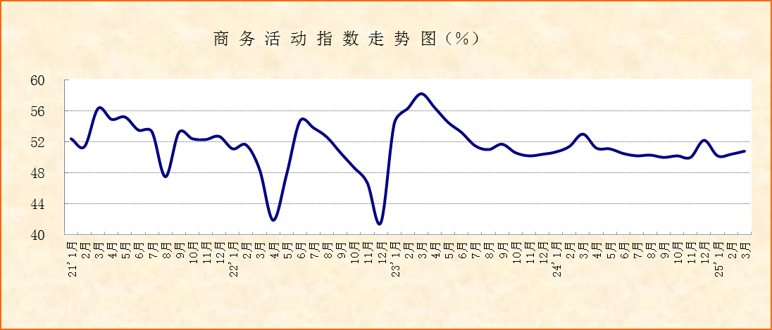 中國物流與采購聯合會、國家統計局服務業調查中心發布的2025年3月份中國非制造業商務活動指數為50.8%,較上月上升0.4個百分點,連續2個月環比上升,升幅較上月稍有擴大,一季度持續運行在50%以上,顯示一季度非制造業經營活動保持擴張,且增速呈現逐月小幅加快走勢。分行業來看,投資相關建筑活動穩步推進,居民線上和線下消費意愿有所增強,信息服務相關行業保持活躍,企業樂觀預期有所升溫。