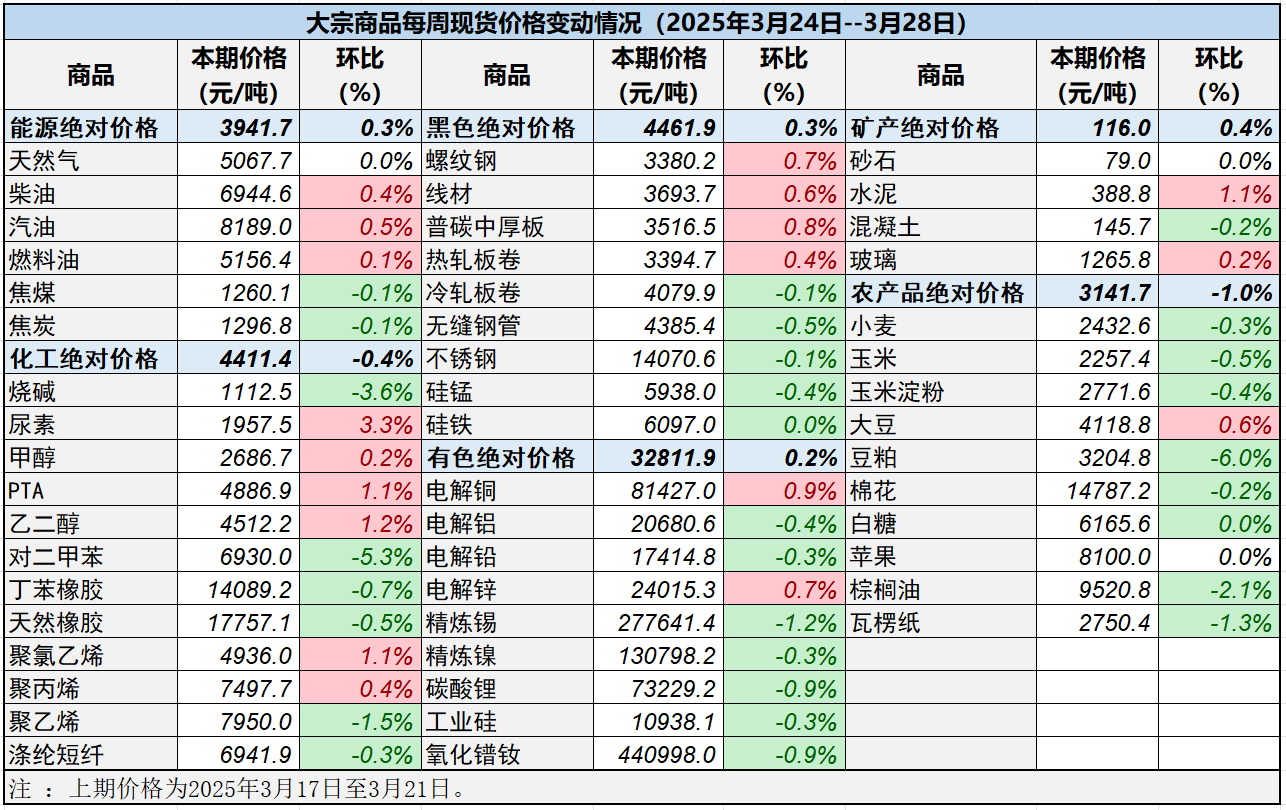 本表所示大宗商品價格(類別與產(chǎn)品規(guī)格說明見附表)為以人民幣計價的現(xiàn)貨價格(包含流通費用、利潤和稅費等)。計算這些價格時使用的信息來源,主要包括國內(nèi)重點地區(qū)的生產(chǎn)商、貿(mào)易商及下游消費企業(yè)之間的成交、詢報盤及可成交價格。價格單位為人民幣元/噸。