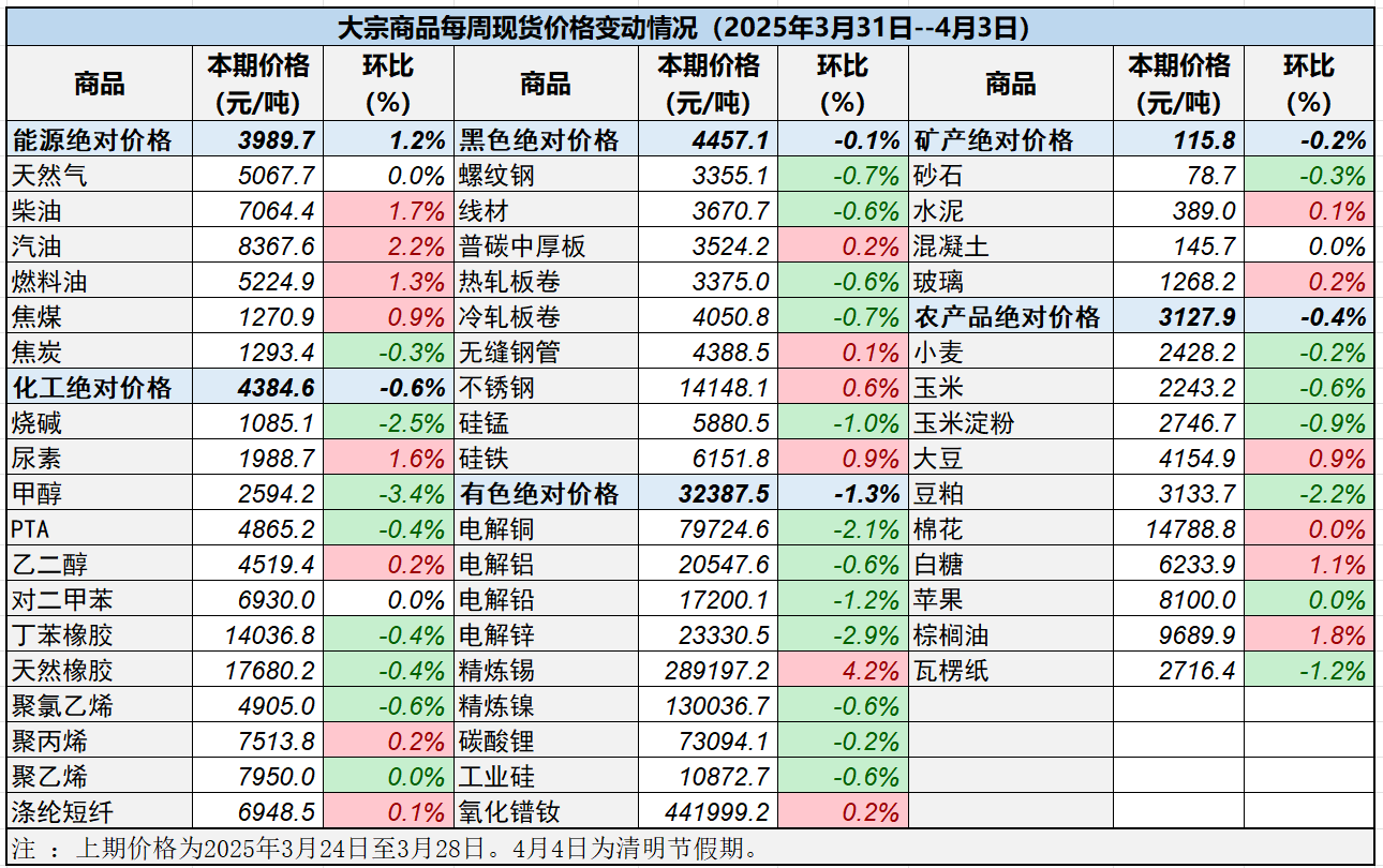 據中國物流與采購聯合會對全國50種重要大宗商品市場價格調查顯示,本期價格(2025年3月31日至4月3日)與上期價格相比,27種(占比54%)大宗商品價格下跌,20(占比40%)價格上漲, 3種(占比6%)價格持平。