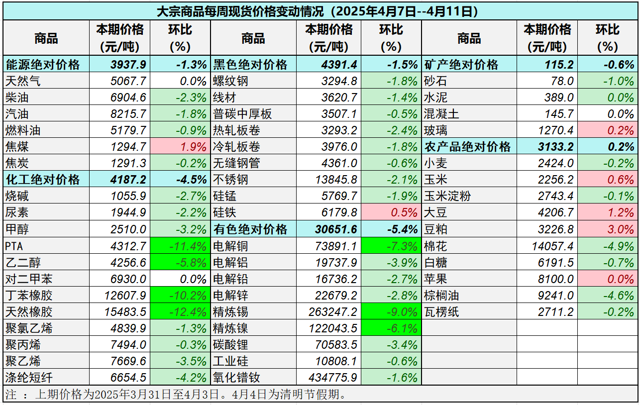 本表所示大宗商品價格(類別與產品規格說明見附表)為以人民幣計價的現貨價格(包含流通費用、利潤和稅費等)。計算這些價格時使用的信息來源,主要包括國內重點地區的生產商、貿易商及下游消費企業之間的成交、詢報盤及可成交價格。價格單位為人民幣元/噸。