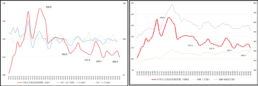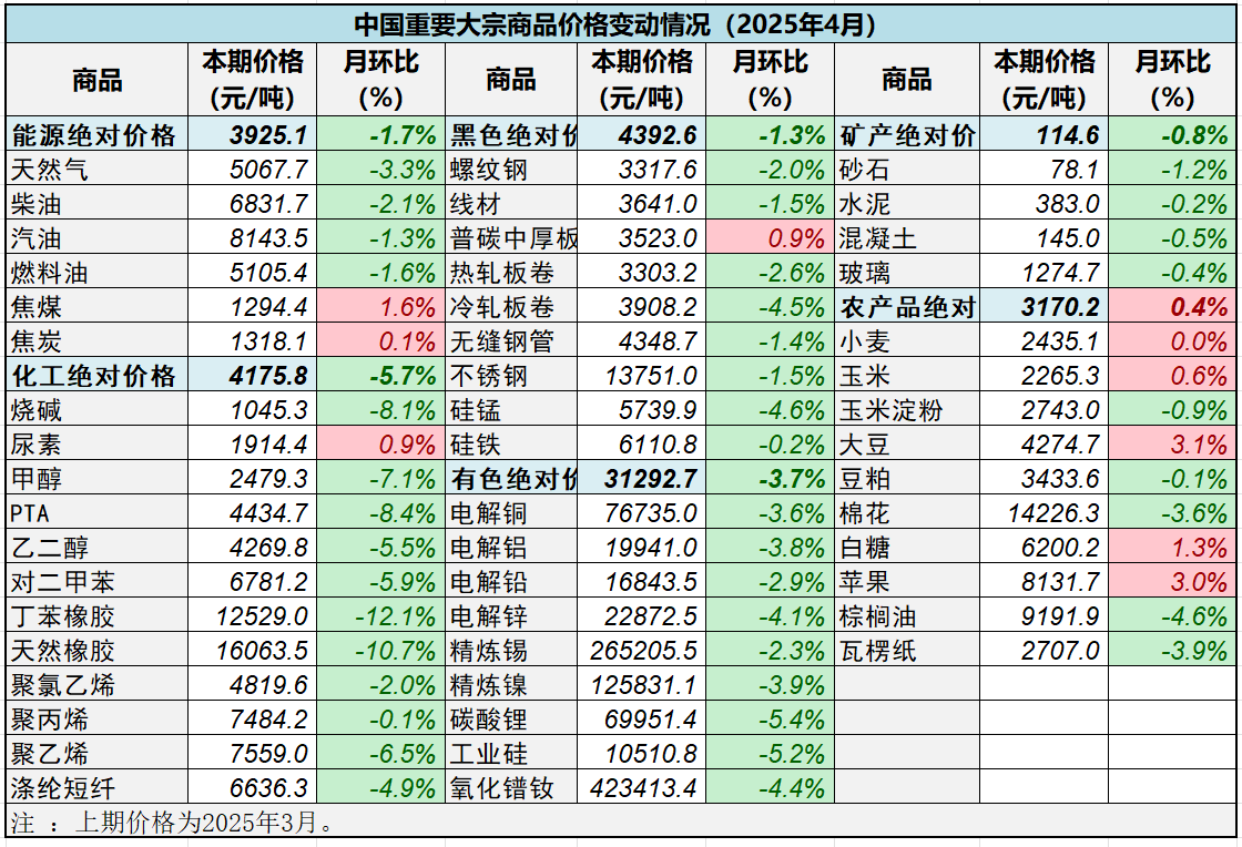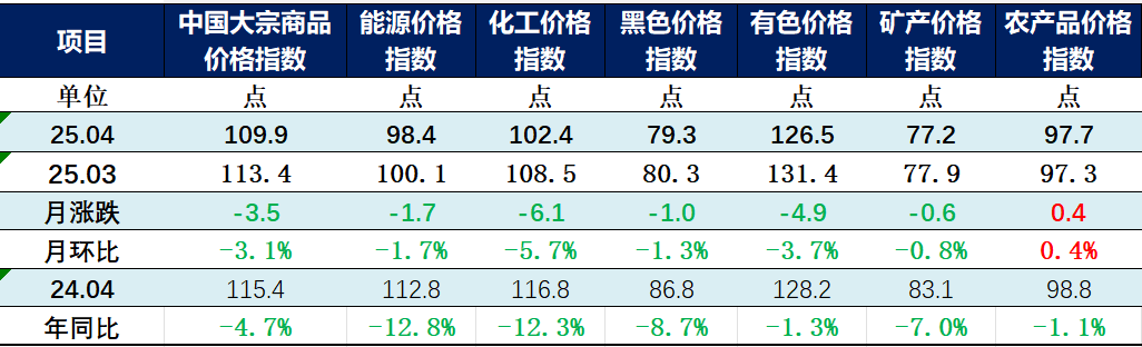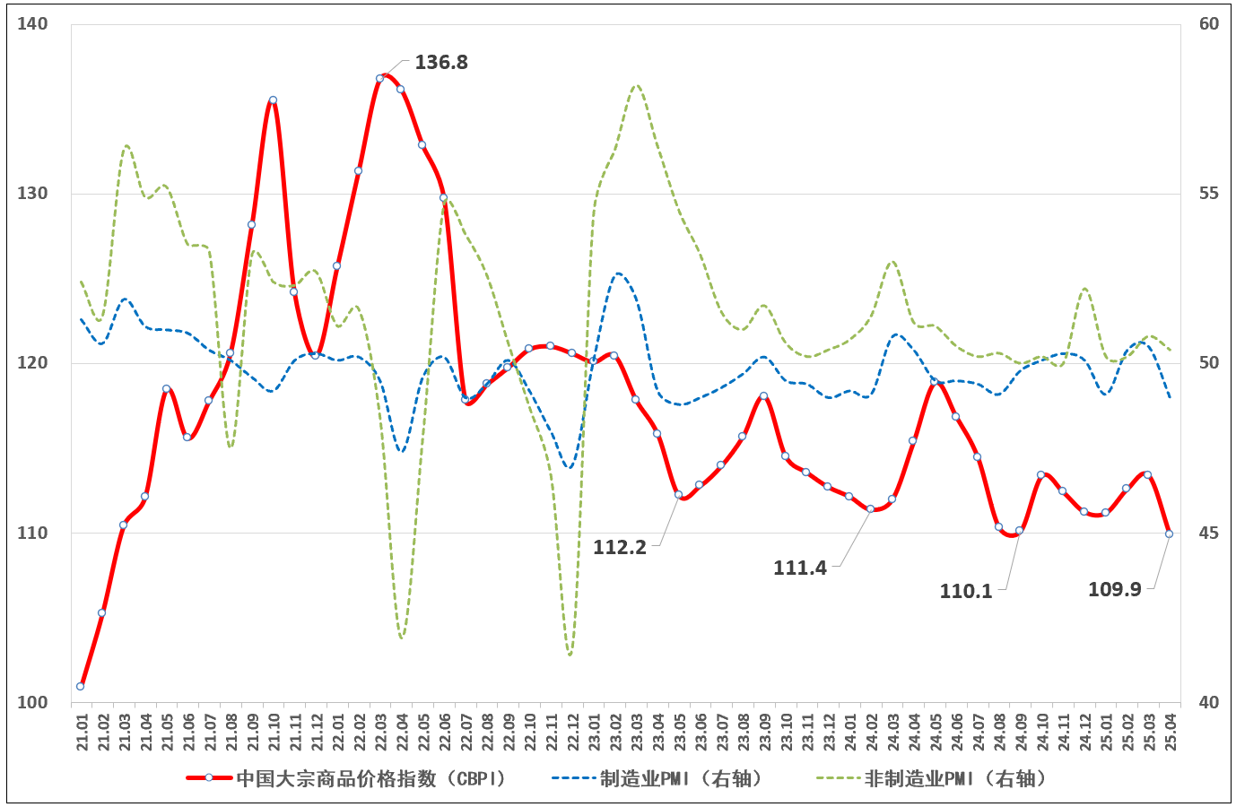 由中物聯大宗商品流通分會和上海鋼聯等單位聯合調查,中國物流與采購聯合會發布的2025年4月份中國大宗商品價格指數(CBPI)為109.9點,環比下跌3.1%,同比下跌4.7%。從指數運行情況來看,主要是受美對等關稅政策加劇全球經濟下行擔憂,以及國際大宗商品價格下跌的輸入性傳導影響。從國內外比較來看,我大宗商品價格指數的環比跌幅,遠小于西方國家CRB指數(-6.6%)和S&P GSCI指數(-8.8%)水平,充分反映我國大宗商品市場的韌性和優勢,能夠有效抵御外部沖擊,保障經濟相對穩定運行。截至4月30日,受中央政治局會議提振,多數大宗商品價格和指數止跌反彈,脫離月內低點,表明企業對未來市場預期總體穩定。后市隨國家系列穩經濟政策的加快推出,以及國內需求的穩定釋放,我國大宗商品市場具備繼續平穩向好運行基礎。