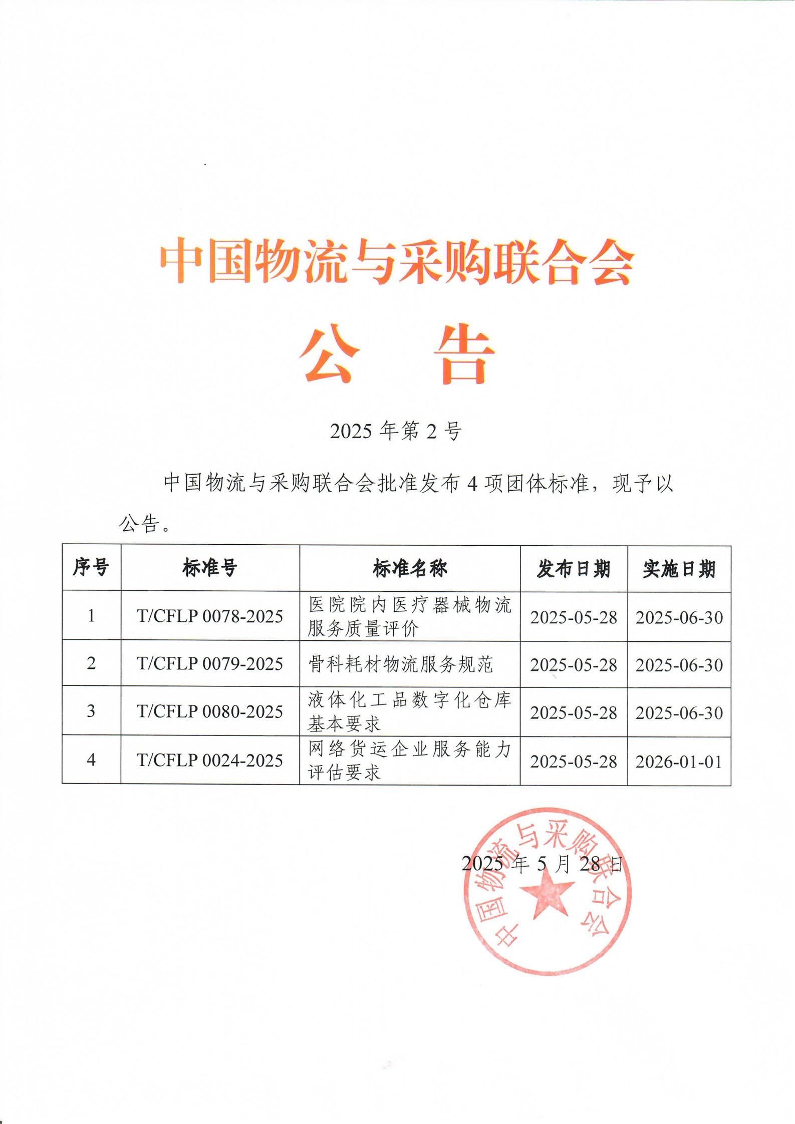 中物聯2025年第2號公告 《醫院院內醫療器械物流服務質量評價》等團體標準發布