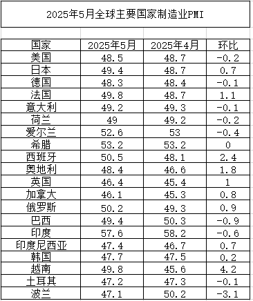 2025年5月全球主要國(guó)家制造業(yè)PMI
