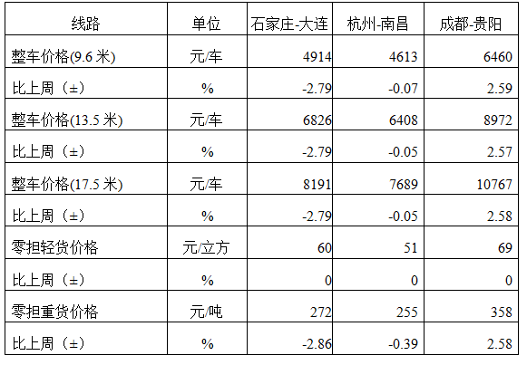 分車型看,各車型指數環比走勢分化。其中,整車指數為1056.50點,比上周回落0.03%;零擔輕貨指數為1026.15點,比上周回升0.03%;零擔重貨指數為1057.19點,比上周回升0.07%。
