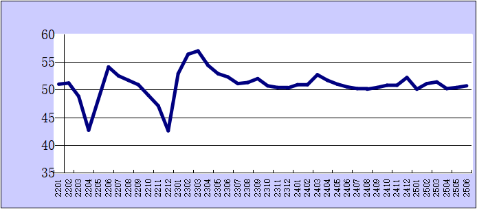 其中,2025年6月份,制造業生產指數為51%,較上月上升0.3個百分點;非制造業商務活動指數為50.5%,較上月上升0.2個百分點。