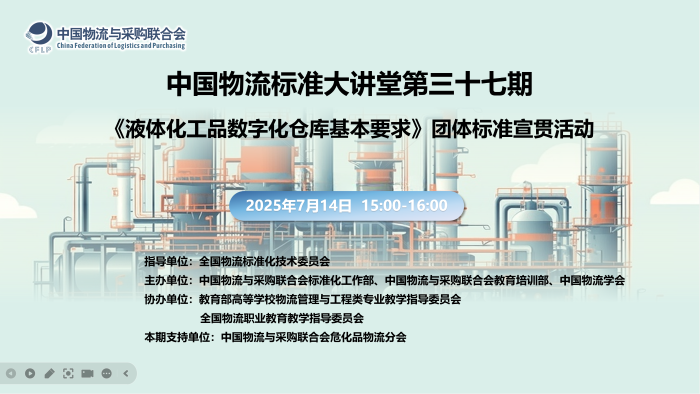 2025年7月14日,在全國物流標準化技術委員會的指導下,中國物流與采購聯(lián)合會標準化工作部、教育培訓部和中國物流學會主辦的中國物流標準大講堂第37期活動對物流團體標準《液體化工品數(shù)字化倉庫基本要求》(T/CFLP 0080-2025)進行了宣貫,2500余人線上參加了宣貫活動。