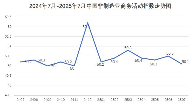 中國物流與采購聯(lián)合會、國家統(tǒng)計局服務(wù)業(yè)調(diào)查中心發(fā)布的2025年7月份中國非制造業(yè)商務(wù)活動指數(shù)為50.1%,環(huán)比下降0.4個百分點。由于非制造業(yè)沒有綜合指數(shù),通常以商務(wù)活動指數(shù)來反映非制造業(yè)經(jīng)濟(jì)的總體變化。