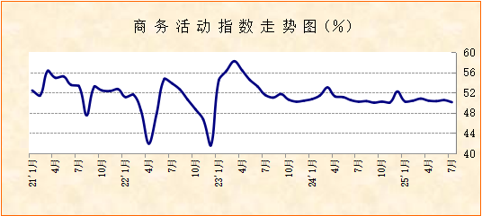 中國物流與采購聯合會、國家統計局服務業調查中心發布的2025年7月份中國非制造業商務活動指數為50.1%,較上月下降0.4個百分點,意味著非制造業經營活動增速較上月有所放緩,仍在擴張區間。分行業看,受雨季影響,建筑業增速有所放緩,建筑業商務活動指數較上月下降,仍在50%以上;暑期消費帶動作用初步顯現,居民購物、出行、郊游和文體娛樂相關活動均有良好表現。