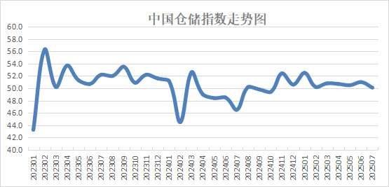 中國物流與采購聯(lián)合會和中儲發(fā)展股份有限公司聯(lián)合調(diào)查的中國倉儲指數(shù),2025年7月份為50.1%,較上月回落0.9個百分點。雖然指數(shù)有所回落,但仍在50%以上,連續(xù)九個月保持在擴張區(qū)間,倉儲行業(yè)整體仍保持良好運行態(tài)勢,只是增速有所放緩。新訂單、平均庫存周轉(zhuǎn)次數(shù)指數(shù)回落,期末庫存指數(shù)回升,顯示受高溫多雨天氣影響,倉儲業(yè)務(wù)需求偏弱,商品周轉(zhuǎn)速度減慢,庫存水平上升。業(yè)務(wù)活動預(yù)期指數(shù)運行在擴張區(qū)間,反映企業(yè)對后市信心依然穩(wěn)固。具體來看,本月指數(shù)呈現(xiàn)以下特征: