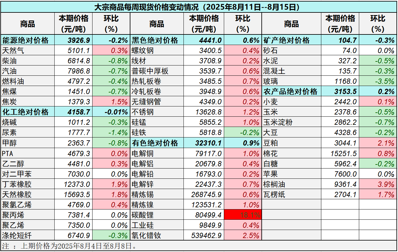 本表所示大宗商品價格(類別與產品規格說明見附表)為以人民幣計價的現貨價格(包含流通費用、利潤和稅費等)。計算這些價格時使用的信息來源,主要包括國內重點地區的生產商、貿易商及下游消費企業之間的成交、詢報盤及可成交價格。價格單位為人民幣元/噸。