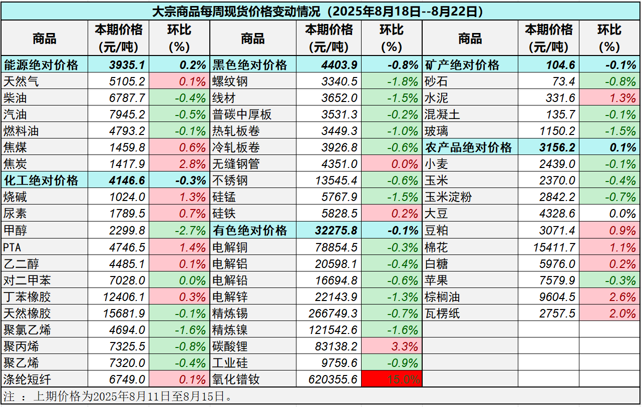 本表所示大宗商品價格(類別與產品規格說明見附表)為以人民幣計價的現貨價格(包含流通費用、利潤和稅費等)。計算這些價格時使用的信息來源,主要包括國內重點地區的生產商、貿易商及下游消費企業之間的成交、詢報盤及可成交價格。價格單位為人民幣元/噸。