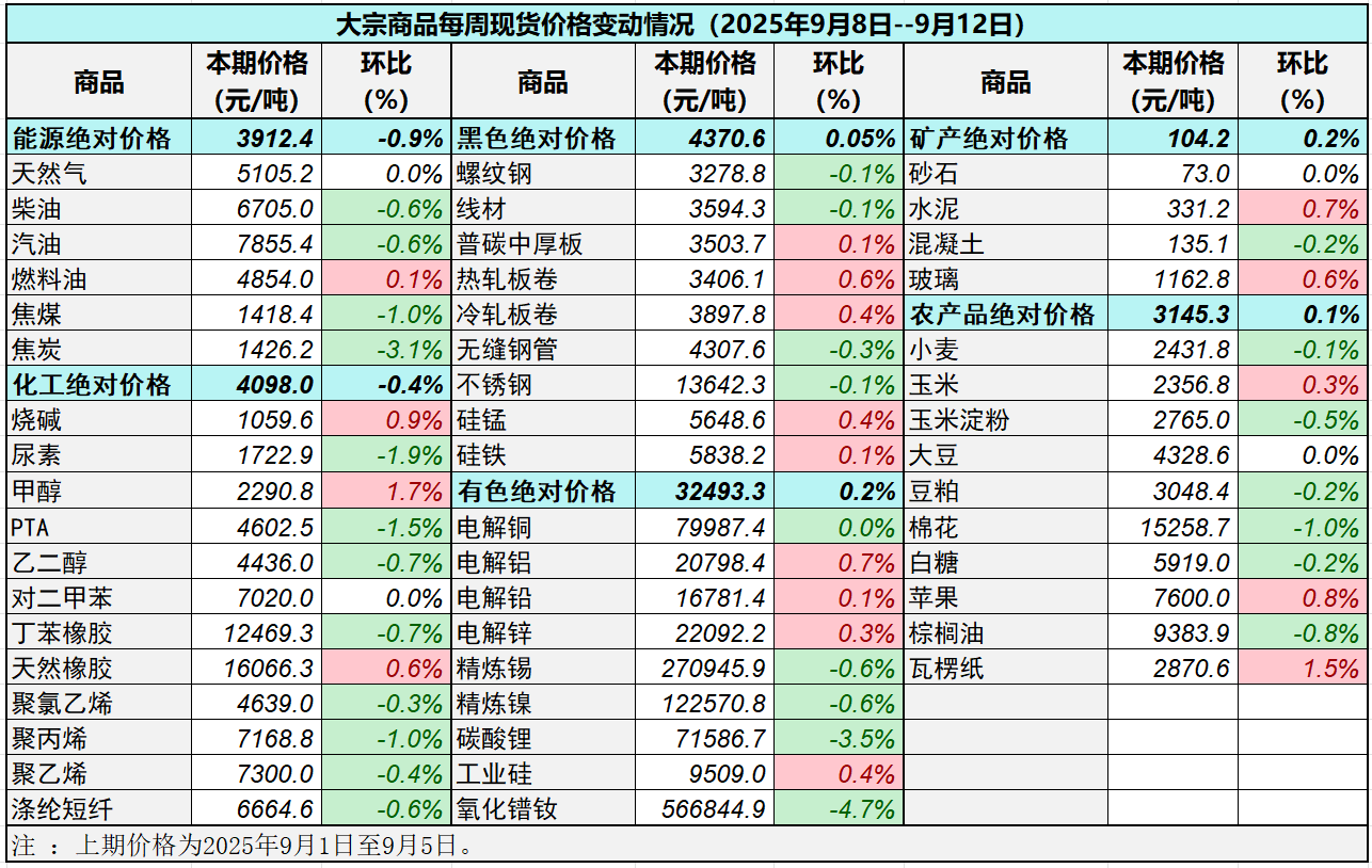 本表所示大宗商品價格(類別與產品規格說明見附表)為以人民幣計價的現貨價格(包含流通費用、利潤和稅費等)。計算這些價格時使用的信息來源,主要包括國內重點地區的生產商、貿易商及下游消費企業之間的成交、詢報盤及可成交價格。價格單位為人民幣元/噸。