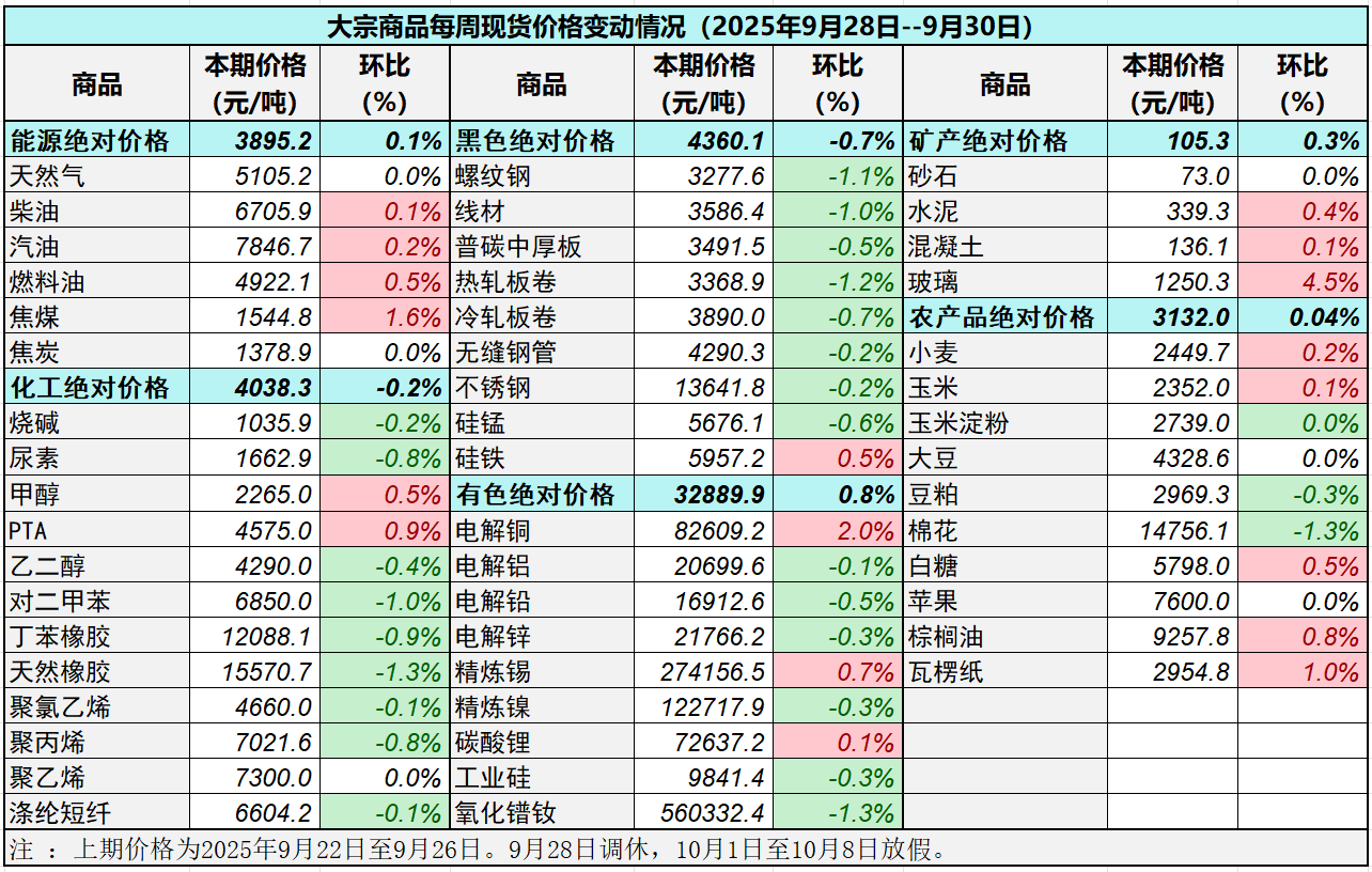 本表所示大宗商品價格(類別與產品規格說明見附表)為以人民幣計價的現貨價格(包含流通費用、利潤和稅費等)。計算這些價格時使用的信息來源,主要包括國內重點地區的生產商、貿易商及下游消費企業之間的成交、詢報盤及可成交價格。價格單位為人民幣元/噸。