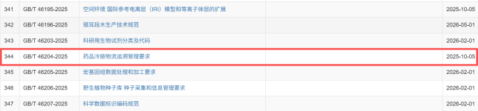 2025年10月5日,國家市場監(jiān)督管理總局、國家標(biāo)準(zhǔn)化管理委員會發(fā)布2025年第24號《關(guān)于批準(zhǔn)發(fā)布<緊固件 六角頭頭部帶孔螺栓第2部分:細(xì)桿 B級>等555項推薦性國家標(biāo)準(zhǔn)和1項推薦性國家標(biāo)準(zhǔn)修改單的公告》,其中包括由全國物流標(biāo)準(zhǔn)化技術(shù)委員會提出并歸口的《藥品冷鏈物流追溯管理要求》(GB/T 46204-2025)國家標(biāo)準(zhǔn)。