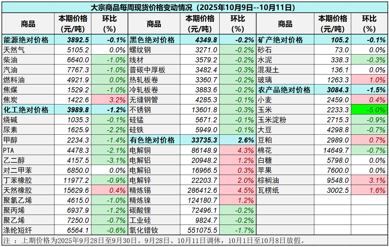 本表所示大宗商品價格(類別與產品規格說明見附表)為以人民幣計價的現貨價格(包含流通費用、利潤和稅費等)。計算這些價格時使用的信息來源,主要包括國內重點地區的生產商、貿易商及下游消費企業之間的成交、詢報盤及可成交價格。價格單位為人民幣元/噸。