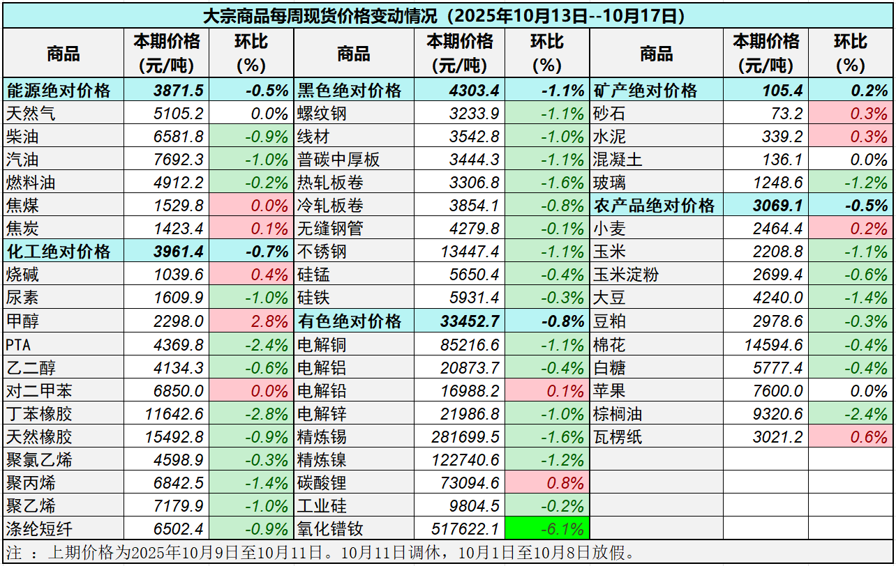 據(jù)中國物流與采購聯(lián)合會對全國50種重要大宗商品市場價格調(diào)查顯示,本期價格(2025年10月13日至10月17日)與上期價格相比,11種(占比22%)大宗商品價格上漲, 36種(占比72%)價格下跌, 3種(占比6%)價格持平。
