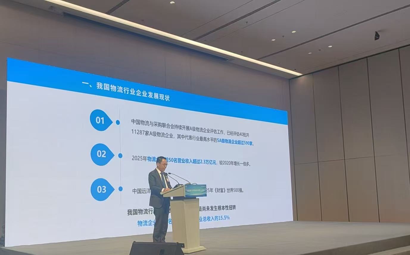 胡大劍在講話中指出,現代物流業是支撐國民經濟發展的基礎性、戰略性、先導性產業。我國有望連續十年成為全球最大物流市場。中共中央辦公廳、國務院辦公廳印發的《有效降低全社會物流成本行動方案》明確提出“培育一批具有國際競爭力的現代物流企業”,凸顯了龍頭物流企業在構建現代物流體系、加快建設物流強國中的關鍵作用。自2005年以來,中物聯持續開展A級物流企業評估工作,已累計評估40批共11287家A級物流企業,其中5A級企業超過590家。2025年物流企業前50強營業收入突破2.3萬億元,較2020年增長一倍多。一批龍頭企業國際競爭力不斷提升,中國遠洋海運集團等7家物流企業躋身2025年《財富》世界500強。然而,我國物流行業“小散弱”格局尚未根本扭轉,行業集中度偏低,缺乏具備全球服務網絡與全程管控能力的領軍企業,與我國全球最大物流市場的地位仍不匹配。