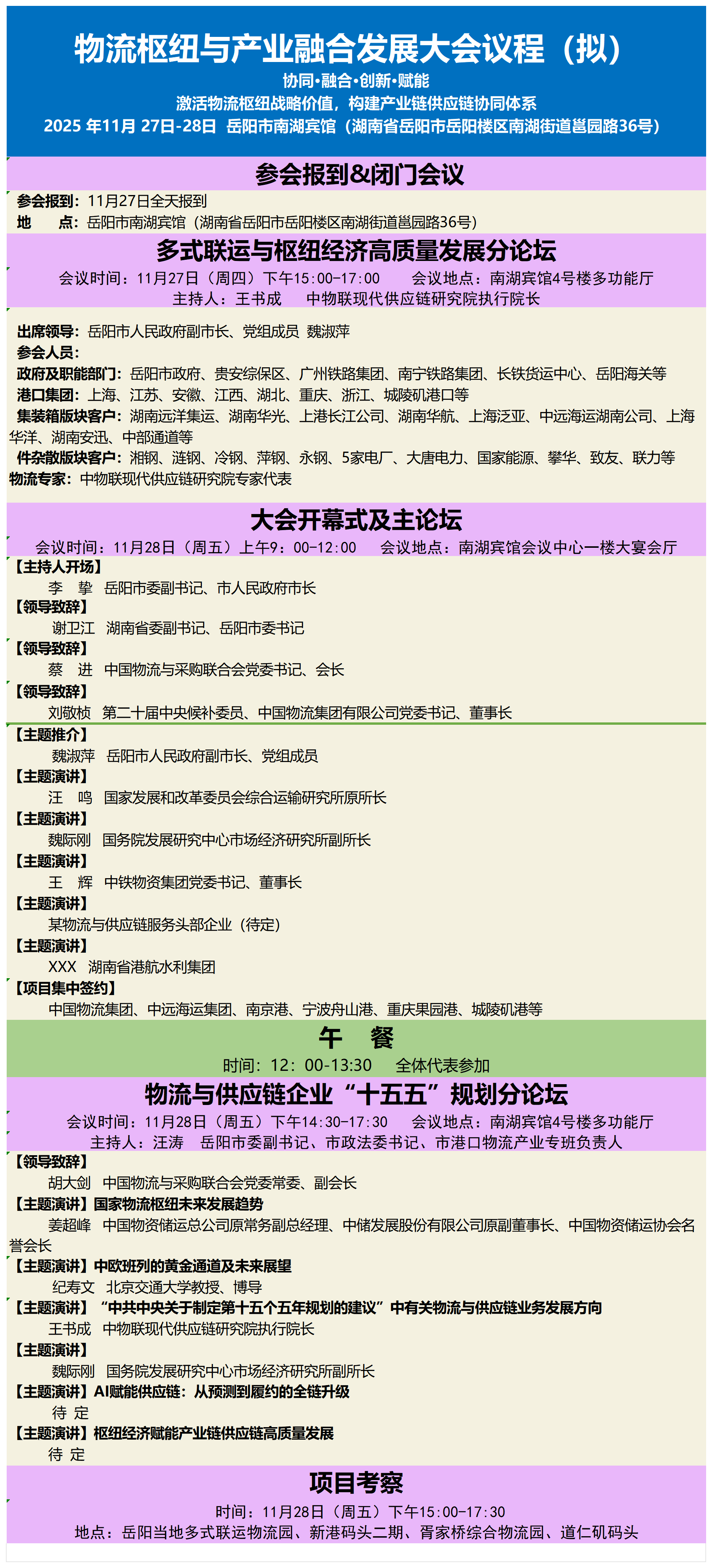 為探索“十五五”期間我國物流與供應鏈服務業發展方向,促進現代物流與產業融合發展,推動區域經濟發展新舊動能轉換,并充分發揮樞紐經濟在構建以國內大循環為主體、國內國際雙循環相互促進的新發展格局中的核心作用,中國物流與采購聯合會與岳陽市人民政府將于2025年11月27—28日在湖南省岳陽市舉辦“物流樞紐與產業融合發展大會”。現將有關事項通知如下: