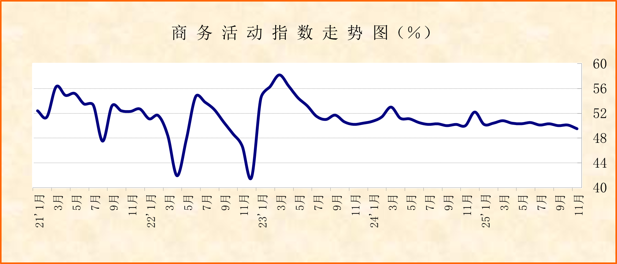 國家統計局服務業調查中心、中國物流與采購聯合會發布的2025年11月份中國非制造業商務活動指數為49.5%,較上月下降0.6個百分點,顯示非制造業經營活動有所放緩。受上月黃金假期高基數影響,消費相關服務業活動呈現淡季回落特征,導致非制造業整體經營活動有所放緩。細分指數變化顯示,金融活動持續發力,新動能行業運行穩健,建筑業活動有所恢復,企業樂觀預期保持穩定。