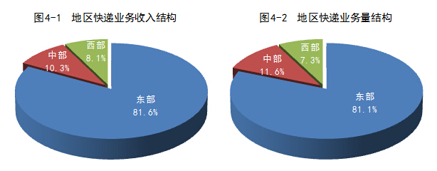 1-4月,東、中、西部地區(qū)快遞業(yè)務(wù)收入的比重分別為81.6%、10.3%和8.1%,業(yè)務(wù)量比重分別為81.1%、11.6%和7.3%。與去年同期相比,東部地區(qū)快遞業(yè)務(wù)收入比重下降了1個(gè)百分點(diǎn),快遞業(yè)務(wù)量比重持平;中部地區(qū)快遞業(yè)務(wù)收入比重上升了0.7個(gè)百分點(diǎn),快遞業(yè)務(wù)量比重上升了0.5個(gè)百分點(diǎn);西部地區(qū)快遞業(yè)務(wù)收入比重上升了0.3個(gè)百分點(diǎn),快遞業(yè)務(wù)量比重下降了0.5個(gè)百分點(diǎn)。