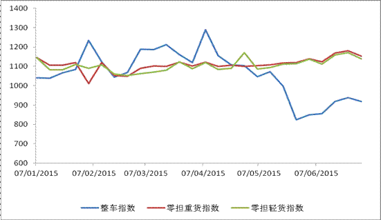 從分車型指數(shù)看,各車型指數(shù)環(huán)比均有小幅回落。整車指數(shù)為919.2點(diǎn),比上周回落2.0%,比年初下降10.4%,但較5月末回升11.5%;零擔(dān)輕貨為1139.4點(diǎn),比上周回落2.8%,比年初回升3.0%,較5月末回升2.3%;零擔(dān)重貨為1153.1點(diǎn),比上周回落2.3%,比年初回升3.8%,較5月末回升3.0%。