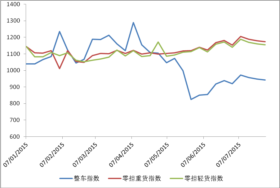 從分車型指數(shù)看,各車型指數(shù)環(huán)比均有小幅回落。整車指數(shù)為943.0點,比上周回落0.62%,比年初回落8.1%,但比5月末回升14.4%;零擔(dān)輕貨為1154.8點,比上周回落0.58%,比年初回升4.4%,比5月末回升3.7%;零擔(dān)重貨為1173.5點,比上周回落0.52%,比年初回升5.7%,比5月末回升4.8%。