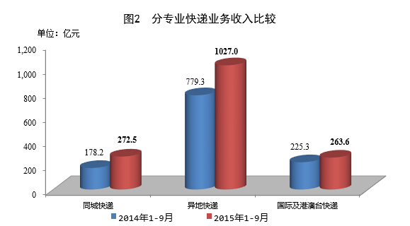 1-9月,同城、異地、國(guó)際及港澳臺(tái)快遞業(yè)務(wù)收入分別占全部快遞收入的14.5%、54.7%和14%;業(yè)務(wù)量分別占全部快遞業(yè)務(wù)量的26.6%、71.3%和2.1%。與去年同期相比,同城快遞業(yè)務(wù)收入的比重上升1.9個(gè)百分點(diǎn),異地快遞業(yè)務(wù)收入的比重下降0.6個(gè)百分點(diǎn),國(guó)際及港澳臺(tái)業(yè)務(wù)收入的比重下降了2個(gè)百分點(diǎn)。