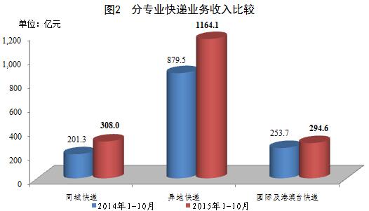 1-10月,同城、異地、國際及港澳臺(tái)快遞業(yè)務(wù)收入分別占全部快遞收入的14.5%、54.6%和13.8%;業(yè)務(wù)量分別占全部快遞業(yè)務(wù)量的26.4%、71.5%和2.1%。與去年同期相比,同城快遞業(yè)務(wù)收入的比重上升1.8個(gè)百分點(diǎn),異地快遞業(yè)務(wù)收入的比重下降0.6個(gè)百分點(diǎn),國際及港澳臺(tái)業(yè)務(wù)收入的比重下降了2.1個(gè)百分點(diǎn)。