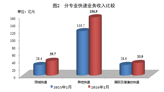 1月,全國快遞服務(wù)企業(yè)業(yè)務(wù)量完成21.6億件,同比增長49.1%;業(yè)務(wù)收入完成291.7億元,同比增長38.1%。其中,同城業(yè)務(wù)收入完成39.7億元,同比增長39.9%;異地業(yè)務(wù)收入完成156.9億元,同比增長31%;國際及港澳臺業(yè)務(wù)收入完成33.9億元,同比增長18.2%。