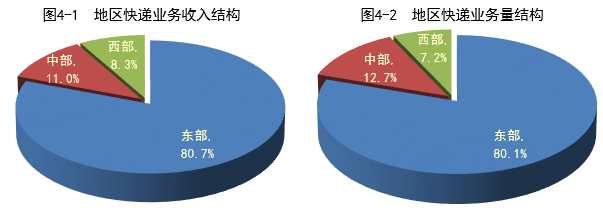 1月,東、中、西部地區(qū)快遞業(yè)務(wù)收入的比重分別為80.7%、11%和8.3%,業(yè)務(wù)量比重分別為80.1%、12.7%和7.2%。與去年同期相比,東部地區(qū)快遞業(yè)務(wù)收入比重下降了1.1個百分點(diǎn),快遞業(yè)務(wù)量比重下降了1.6個百分點(diǎn);中部地區(qū)快遞業(yè)務(wù)收入比重上升了0.9個百分點(diǎn),快遞業(yè)務(wù)量比重上升了1.4個百分點(diǎn);西部地區(qū)快遞業(yè)務(wù)收入比重上升了0.2個百分點(diǎn),快遞業(yè)務(wù)量比重上升了0.2個百分點(diǎn)。