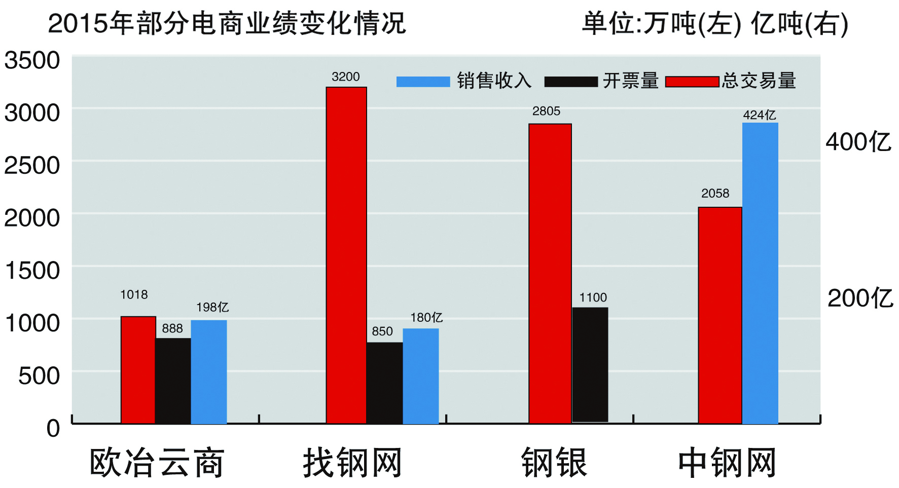據2015年公開數據顯示,鋼銀寄售量(開票量)大約在1100萬噸左右,總交易量2805萬噸;歐冶云商結算量(開票量)888萬噸,總交易量1018萬噸,實現銷售收入198億元;找鋼網的找鋼商城(開票量)850萬噸,總交易量超過3200萬噸,銷售額180多億元;中鋼網營業收入73億元(不含稅)左右,總交易量2058萬多噸的鋼材交易,交易金額達424億元;鋼為網的線上交易額達到了1400億元,累計有5萬家客戶通過鋼為網實現了在線的貿易。