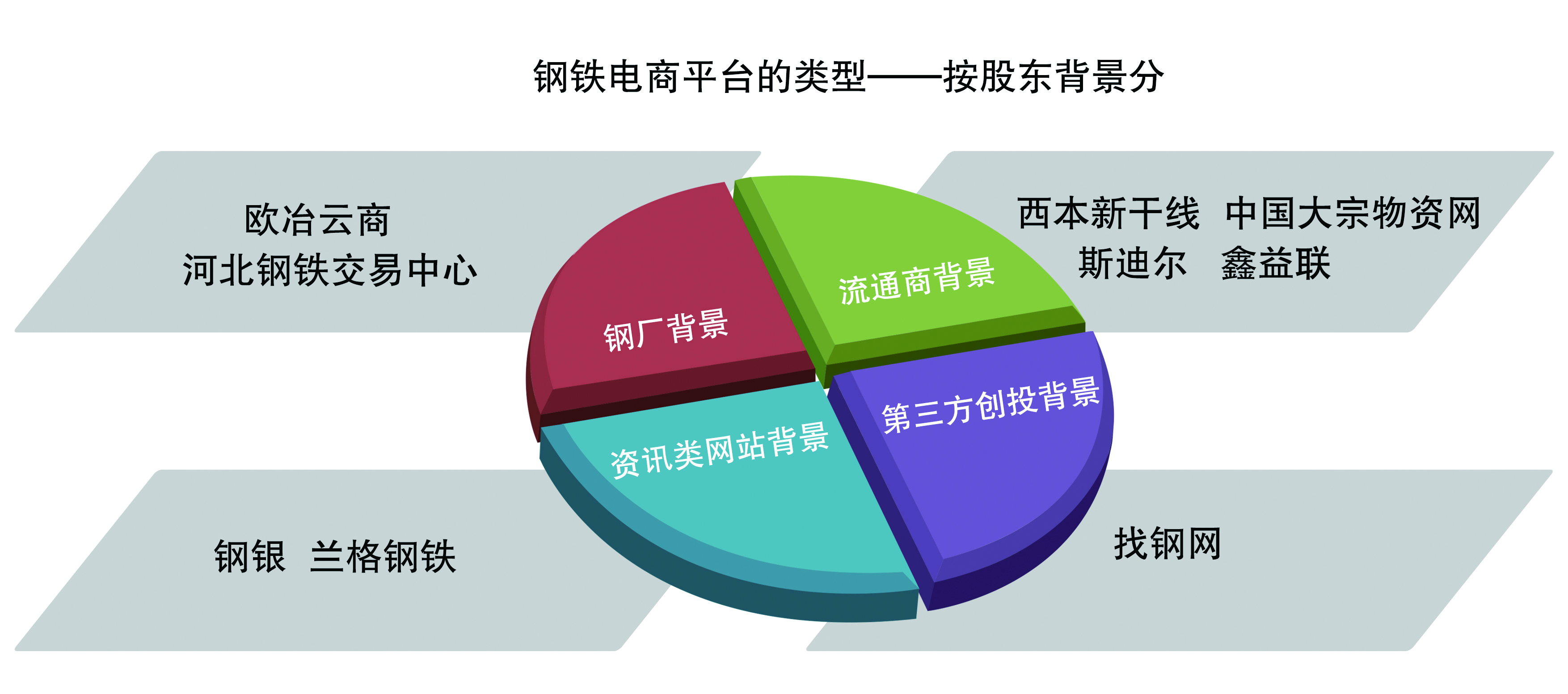 根據鋼鐵電商平臺的不同股東背景,鋼鐵電商平臺可以分為鋼廠自建電子商務銷售平臺、大型鋼鐵流通商搭建的電商平臺、咨詢信息平臺轉建電商平臺與第三方創投投建的電商平臺四類。