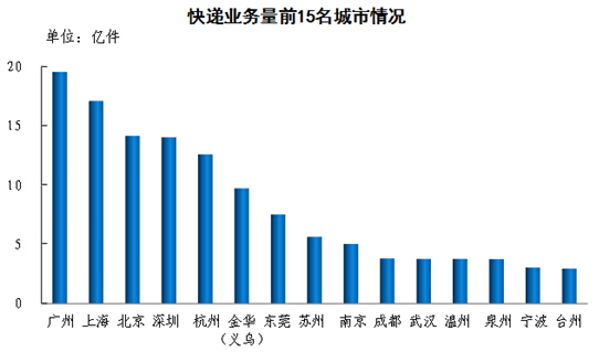 快遞業務量排名前十五位的城市依次是廣州、上海、北京、深圳、杭州、金華(義烏)、東莞、蘇州、南京、成都、武漢、溫州、泉州、寧波和臺州,其快遞業務量合計占全部快遞業務量的比重達到61.1%。