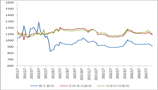 各車型指數環比有不同程度回落,其中零擔輕貨指數回落幅度高于整車指數,整車指數回落幅度高于零擔重貨指數。本周,整車指數為911.4點,環比回落1.6%,比上年同期下降3.0%;零擔重貨指數為1087.1點,環比回落1.4%,比上年同期下降7.5%;零擔輕貨指數為1101.5點,環比回落2.0%,比上年同期下降4.3%。