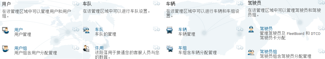 FleetBoard®系統(tǒng)可以通過建立“子車隊(duì)”或“駕駛員組”的方式,為有分公司或多條線路的客戶實(shí)現(xiàn)分層、分組管理,提高對(duì)車輛和駕駛員的管理效率。FleetBoard®在帳戶權(quán)限上也可以設(shè)置分層,車隊(duì)長或駕駛員組組長可以查看車隊(duì)或駕駛員組的信息,而企業(yè)高層管理人員或企業(yè)主則擁有最高權(quán)限,可以看到所有車隊(duì)、車輛及駕駛員信息。