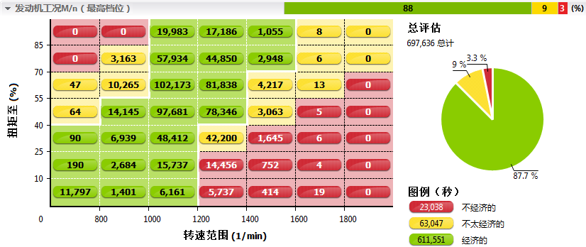 將車輛盡量保持在高擋位,也是讓車輛達(dá)到最佳經(jīng)濟(jì)性的方法之一。從上表可以看出,先比1月份,該車輛3月份擋位配合得更好,最高擋行駛占比更大。