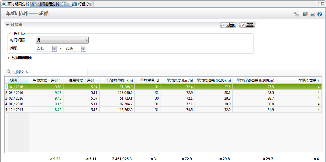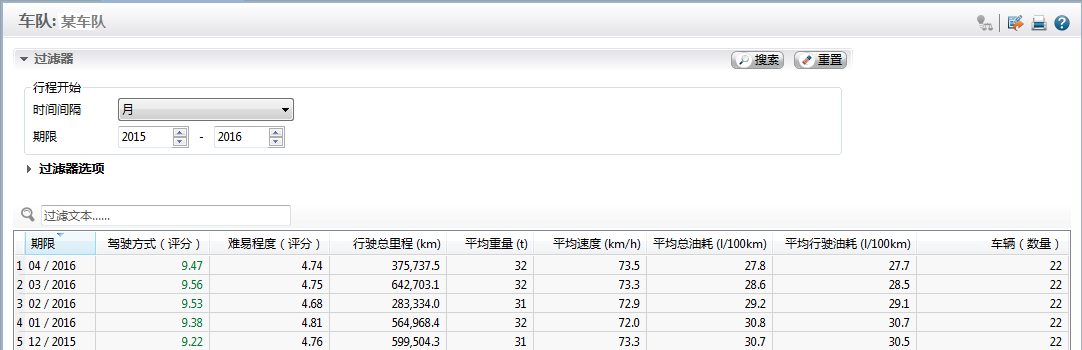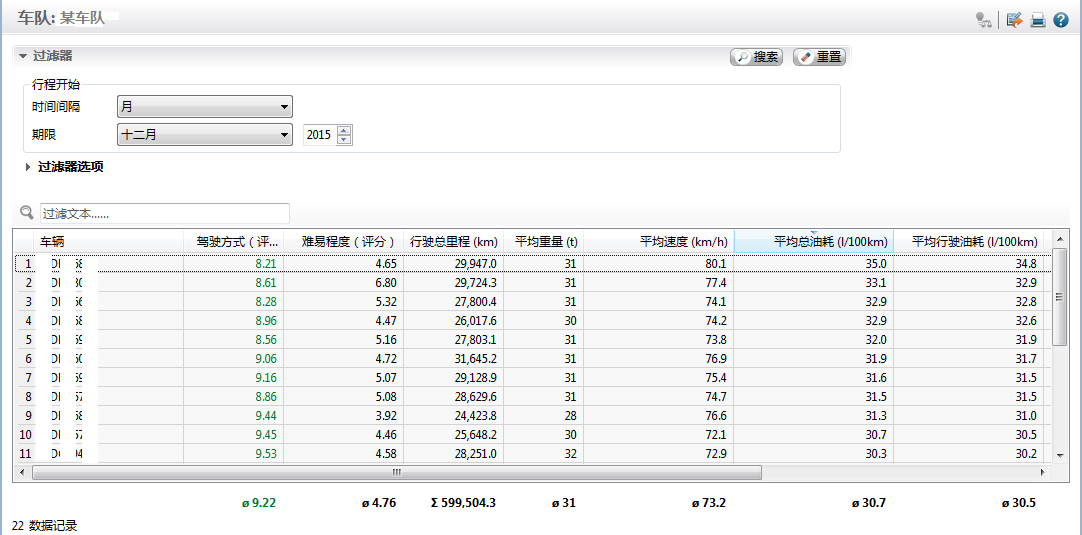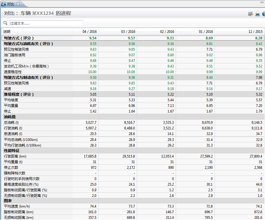 可以看出,在車隊(duì)平均重量、平均速度基本保持不變的情況下,車隊(duì)4臺(tái)車平均駕駛得分穩(wěn)步上升,從8.7分提升至穩(wěn)定在9.5分;車隊(duì)平均油耗逐月下降,從接近32L/100km,下降至27.5L/100km,平均油耗下降4.5L,降幅達(dá)13.7%。