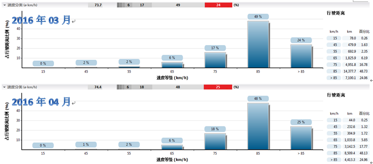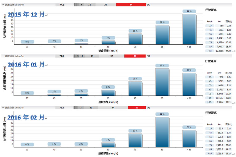 從上述連續(xù)5個(gè)月的速度分類對(duì)比圖可以看出,2015年12月該車輛44%的路程行駛速度大于85km/h,而奔馳車輛的最佳經(jīng)濟(jì)時(shí)速在75-85km/h之間(即85柱狀圖下)。