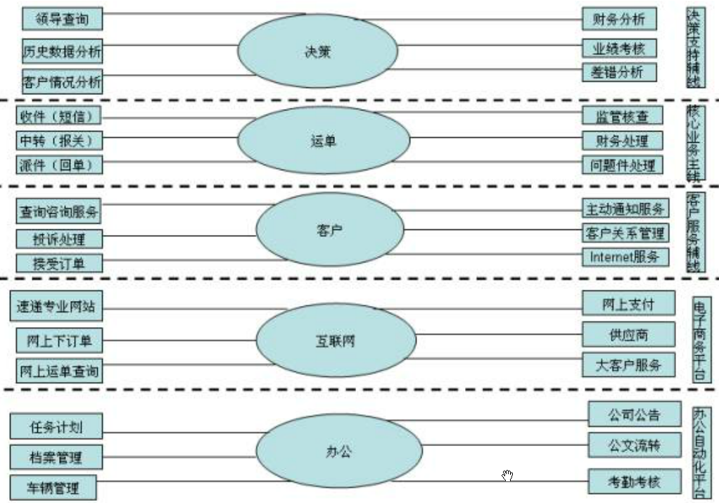 專業批發市場的城市配送業務的核心是訂單(即快件/運單),所有業務的處理都是圍繞訂單展開的,林安物流的整個系統可以歸納為一條業務主線、兩條輔線和兩個業務平臺,分別是:以運單中心的核心業務系統、以客戶為中心的客戶服務系統、以決策為目標的領導決策支持系統,兩個平臺包括辦公自動化平臺和電子商務平臺。其操作模式主要是通過信息化將物流園區與專業市場對接,專業市場在林安物流網上下指令,然后廣東林安物流發展有限公司指派廣州林安匯信物流有限公司承擔物流配送服務。