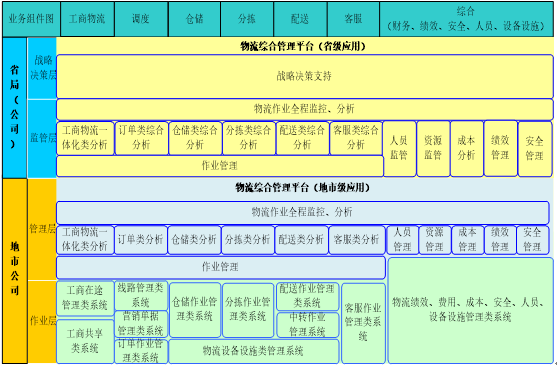 物流業務管理的信息化需求主要分為兩個需求層次、十個需求主題,兩個需求層次分別是:省局(公司)的物流監管及戰略決策層;地市公司物流管理及物流作業支撐層。十個需求主題分別是:物流人員管理、物流資源管理、物流作業監管、物流安全管理、物流成本管理(包括物流成本和費用)、物流績效管理、報警監控、物流業務協同、物流決策支撐、物流文化建設。