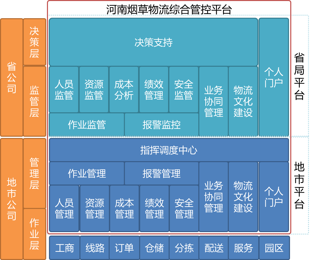 省級信息平臺主要服務于河南省煙草專賣局(公司)的高層領導及物流處領導,戰略決策層主要的物流業務職能是進行全省的供應鏈戰略決策、儲備能力規劃決策、物流網絡與資源配置決策、工商協同決策、物流管理決策、全省卷煙物流綜合分析,以及工商物流、訪銷訂單、倉儲、分揀、配送、客服、對標貫標等專項分析。監管層主要服務于河南省煙草專賣局(公司)的物流處業務主管領導、物流業務相關處室領導,省級物流綜合管理指揮主要的物流業務職能是進行全省卷煙物流建設的規劃管理、物流項目的技術論證和審查、物流運行規范化、標準化統一管理、物流運行的成本費用和質量安全測評考核管理以及卷煙物流作業全程監控、物流成本\費用、預算管理、物流績效、設備設施、物流人員、物流安全以及工商在途、工商共享、訪銷訂單、倉儲、分揀、配送、客服等專項管理、評估以及統計分析。