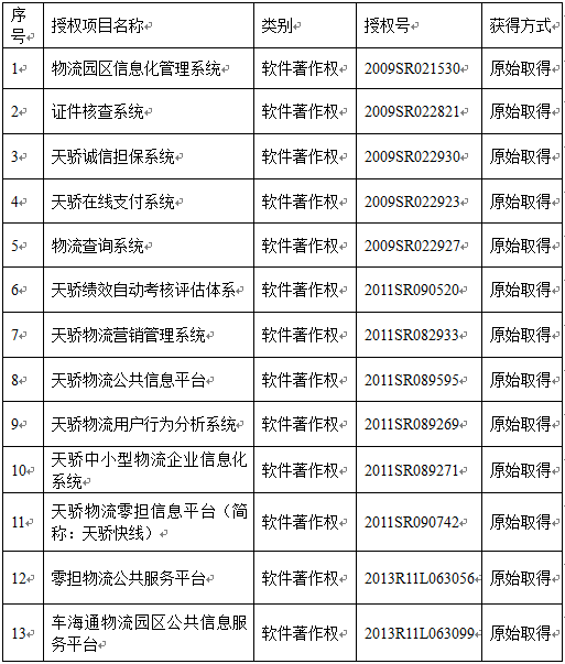 通過公司研發團隊的共同努力和刻苦公關,公司研發的《天驕快車》、《牛運網》、《天驕動車》、《車車網》、《園區信息化管理系統》、《物流查詢系統》、《中小型物流企業信息系統》、《誠信擔保系統》等主要產品,受到了市場的高度認可與廣泛應用,市場占有率達到95%以上。目前,注冊企業用戶達23000多家,成為會員用戶企業達到16870多家。相關產品獲得軟件著作權13項。