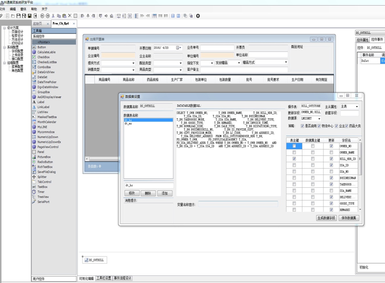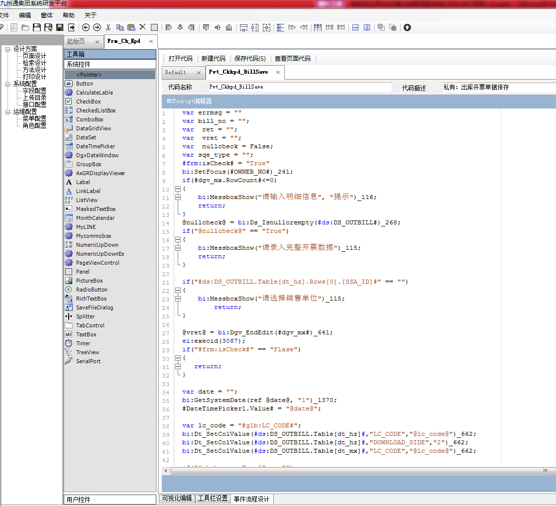 2、解決方法:研發MSP二次開發平臺,進行可視化頁面設計、數據綁定設計、控件屬性、事件設計、生成描述性的文件;加載時根據文件,按控件描述屬性布局,加載數據,屬性,委托事件。