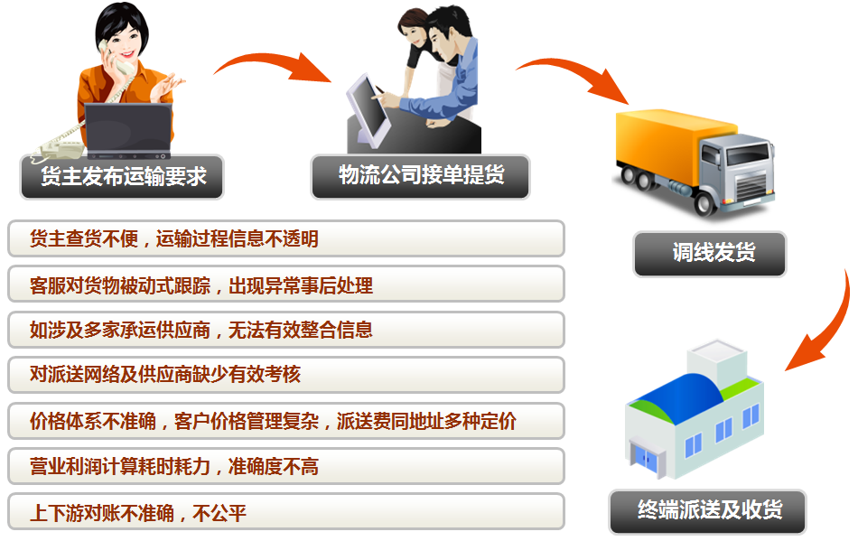 1、企業(yè)的高速發(fā)展使老式的信息系統(tǒng)無(wú)法配合復(fù)雜的綜合物流業(yè)務(wù),員工職責(zé)劃分不明確,沒(méi)有完善的管理流程及貨物處理流程,造成管理效率低下,業(yè)務(wù)無(wú)法順利擴(kuò)展; 2、外站駐場(chǎng)員工預(yù)運(yùn)單錄入無(wú)法及時(shí)準(zhǔn)確錄入系統(tǒng),總部和外站貨物訂單信息不同步。節(jié)點(diǎn)貨物信息無(wú)法自動(dòng)推送短信、微信通知,并且對(duì)簽收信息無(wú)法自動(dòng)獲取。 3、內(nèi)部信息孤島嚴(yán)重,空運(yùn)、陸運(yùn)、供應(yīng)鏈項(xiàng)目獨(dú)立運(yùn)作無(wú)法統(tǒng)一控制,貨物異常率高,客服人員被動(dòng)式查貨,工作效率低,無(wú)法進(jìn)行客戶維護(hù)及售后服務(wù),客戶流失率高;貨物異常率高,信息不暢,無(wú)法追根溯源找到責(zé)任人,導(dǎo)致企業(yè)負(fù)擔(dān)大量賠償款項(xiàng);