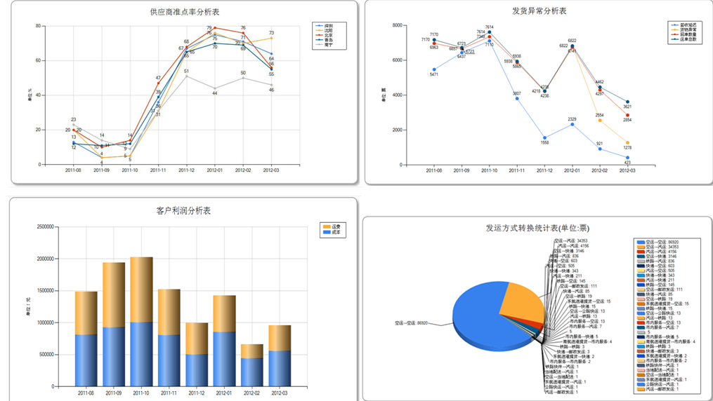實(shí)現(xiàn)各種統(tǒng)計(jì)報(bào)表,功能包括:各種客戶發(fā)貨量統(tǒng)計(jì)報(bào)表、出貨量統(tǒng)計(jì)報(bào)表、收入報(bào)表、支出報(bào)表、運(yùn)單利潤(rùn)報(bào)表等。