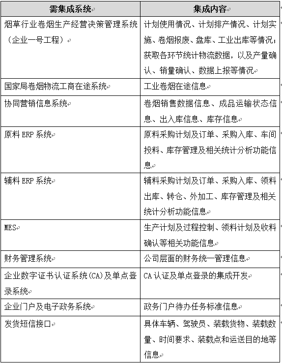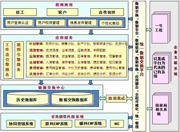根據(jù)需求,甘肅煙草此次進行的物流系統(tǒng)的建設(shè)需要接入的系統(tǒng)有煙草行業(yè)卷煙生產(chǎn)經(jīng)營決策管理系統(tǒng)(一號工程)、國家局工商在途系統(tǒng)、協(xié)同營銷信息系統(tǒng)、企業(yè)數(shù)字證書認證系統(tǒng)(CA)、單點登錄系統(tǒng)等。在實施過程中,即要對現(xiàn)有信息系統(tǒng)做無縫的對接,同時對未來業(yè)務(wù)發(fā)展需要預(yù)留必要的信息系統(tǒng)接口。